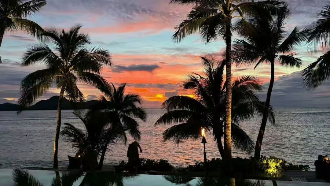 The seaside sunset unfolds like a beautiful dream: coconut trees, their silhouettes outlined as if in ink wash, stand still as a poem in the twilight; the sunset glow splashes layers of tangerine, crimson purple, and soft pink, dyeing the sky into a brocade; the sea shimmers with broken golden light, resonating with the flowing clouds in the sky to weave a quiet yet magnificent harmony between the sea and heaven.